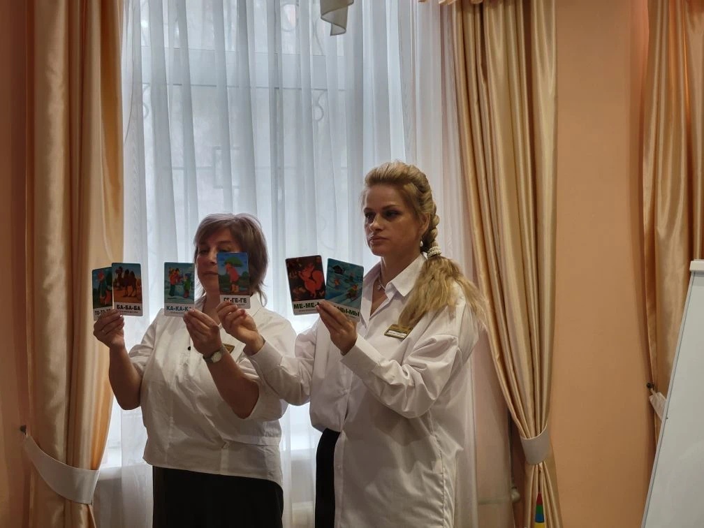 На этом занятии опытом работы по запуску речи у неговорящих детей, используя пособия методики Новиковой-Иванцовой Т.Н., поделилась учитель-логопед ГБДОУ «Детский сад № 34» Кравцова Л.А. Занятия по пособию Новиковой-Иванцовой – это возможность для детей с тяжелыми нарушениями речи научиться общаться с людьми. Учитель-логопед ГБДОУ № 34 Симакова В.Г. позволила участникам представить себя в роли родителя ребенка с ОВЗ, проведя мастер-класс «Карточки для запуска речи. Домашнее применение для родителей».