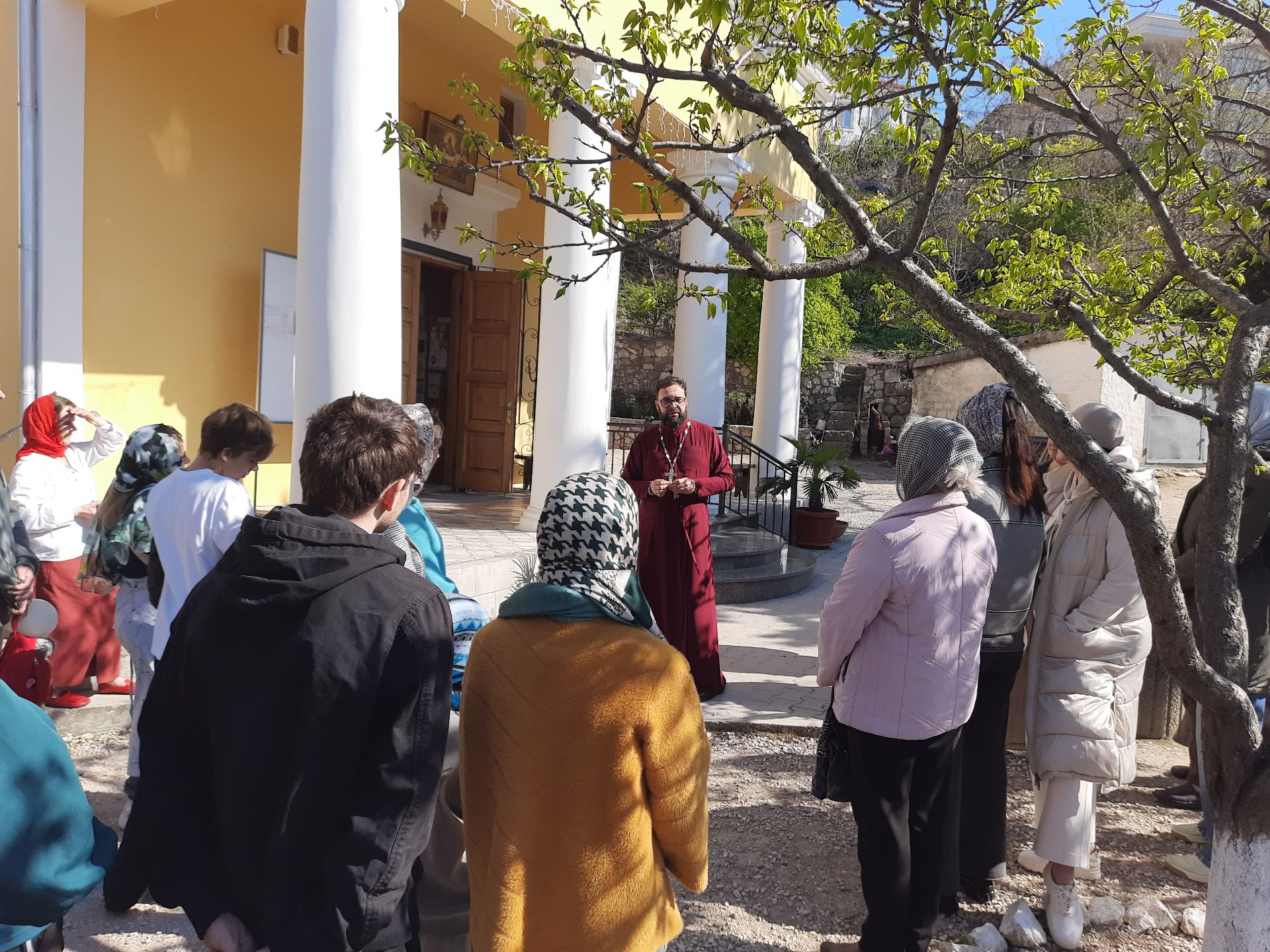 Благочинный Балаклавского округа Отец Михаил провёл для слушателей курсов экскурсию в Храм двенадцати апостолов в Балаклаве. Учителя познакомились с историей и устройством храма, узнали интересные факты о православии и иконах. После экскурсии Отец Михаил пригласил педагогов в кафе «Родная пристань», где угостил всех чаем с куличами. В непринуждённой атмосфере ответил на вопросы учителей по основам православной культуры.